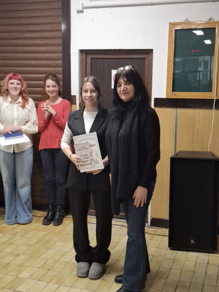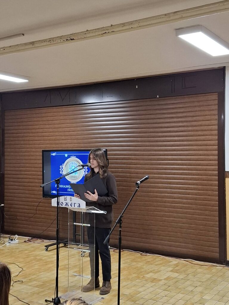 У петак, 23.01.2026, са почетком у 17:30h у холу школе, одржано је годишње такмичење из беседништва са темом Разговори, у организацији Анкице Станисављевић (наставник српског језика) и Жељка Тешића (наставник филозофије). Као и претходних година, такмичење је ученицима омогућило да испоље своје идеје и ставове, као и да покажу вештине јавног наступа и говора. Учесници су изразили јединствене перспективе, а својим посвећеним наступима, ентузијазмом, и јасноћом језика и мисли, одушевили су публику, коју су чинили ученици школе, гости и наставници. Посебну захвалност изражавамо колегама које су допринеле организацији такмичења: Александру Шиндићу (наставнику музичке културе), који је обезбедио озвучење, и Дејану Станчићу (наставнику информатике), који је омогућио визуелну и техничку подршку.